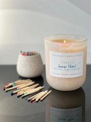 A scented, soy wax candle made from USA-grown soy wax and a lead-free, cotton wick. Housed in a swirled frosted glass tumbler with a sustainably sourced, natural pine lid.