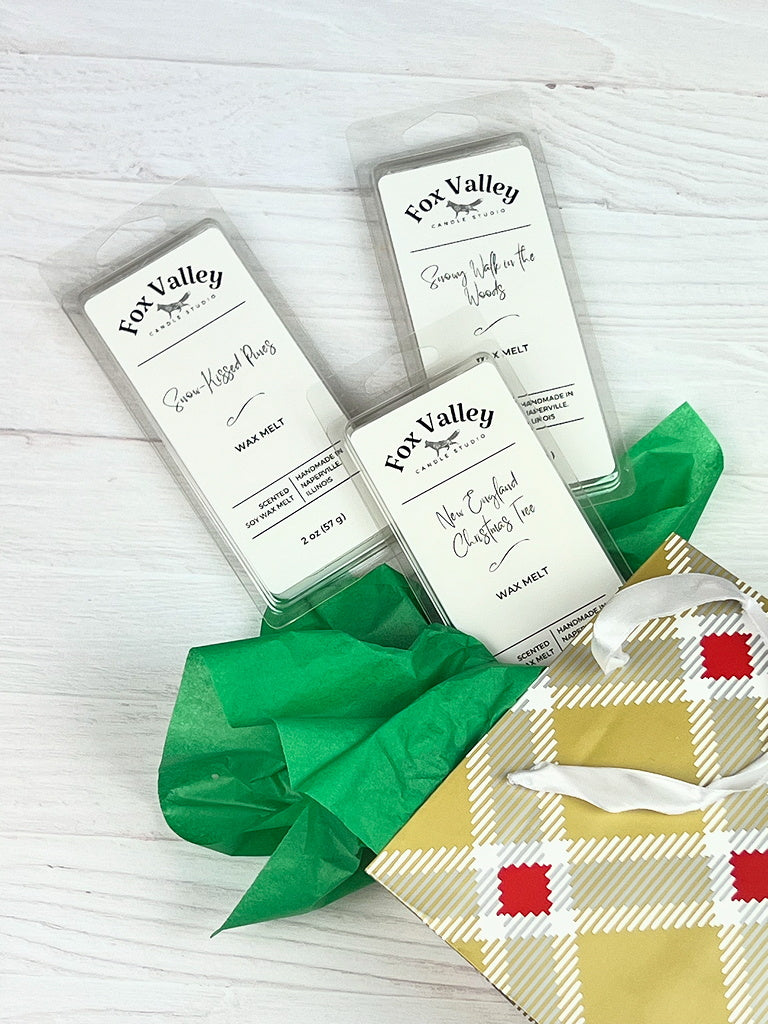 A bundle of three different holiday-related wax melt bars at a discounted price. Each wax melt is hand-poured into our convenient candy bar-sized "snap bars". This bundle contains